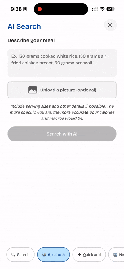 Just describe what you ate — and add a photo if you want — and the app will handle the calorie and macro estimates from there.